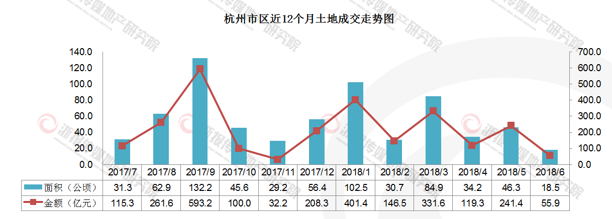 6月,杭州市区共成交五宗土地,成交总面积18.5公顷(折合277.8亩),总可建面积44.2万方,总成交金额55.9亿元。